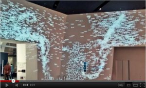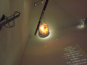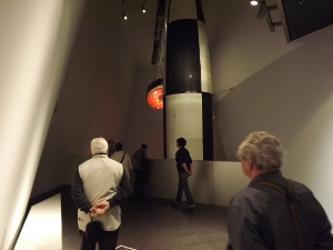Das Objekt selber war schnell gefunden. An der Decke hängend, unerreichbar, in einer Entfernung von zig Metern. Details ließen sich nur mittels Teleobjekttiv, bzw. Fernglas erkennen. Fotografieren war auf Grund der Größe und der Verschachtelung des schrägwandigen Raumes nicht richtig möglich. Die Kapsel war kombiniert mit einer A4-Rakete um „…. die Entwicklung der Militär-Raketentechnik bis zur heutigen bemannten Raumfahrt darzustellen soll. …“. Wobei, eigentlich war die Sojus die Ergänzung zur überdimensional wirkenden A4. An jene kam man auch heran. An der Wand flimmerte eine Video-Installation mit Texten aus Friedrich Dürrenmatt’s Theaterstück „Die Physiker“.